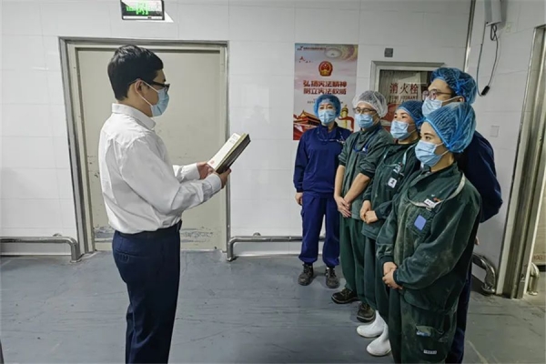 图为10月26日,食品公司党支部红色班前会上,党支部宣讲员刘晓天领读“三个务必”“三件大事”“六个必须坚持”等内容。通过学习,员工们表示要以党的二十大精神为指引,做好航班配餐保障工作,助力机场建设世界一流空港。