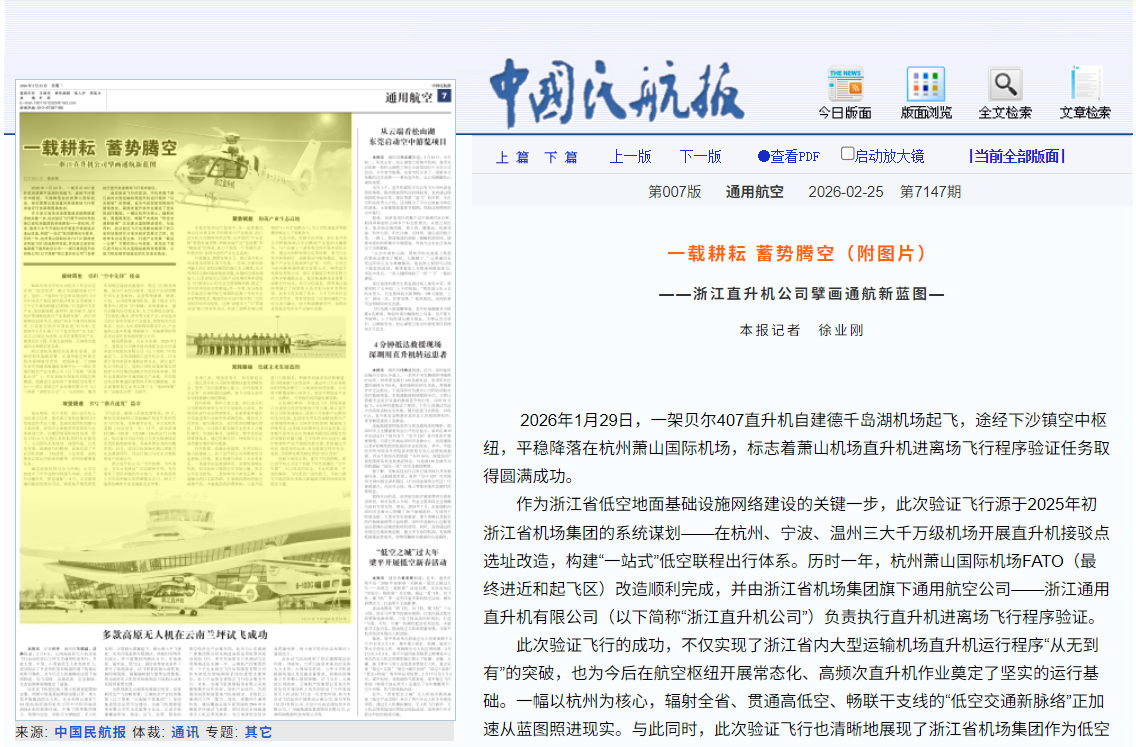 2月25日,中国民航报发布《一载耕耘 蓄势腾空-浙江直升机公司擘画通航新蓝图》。