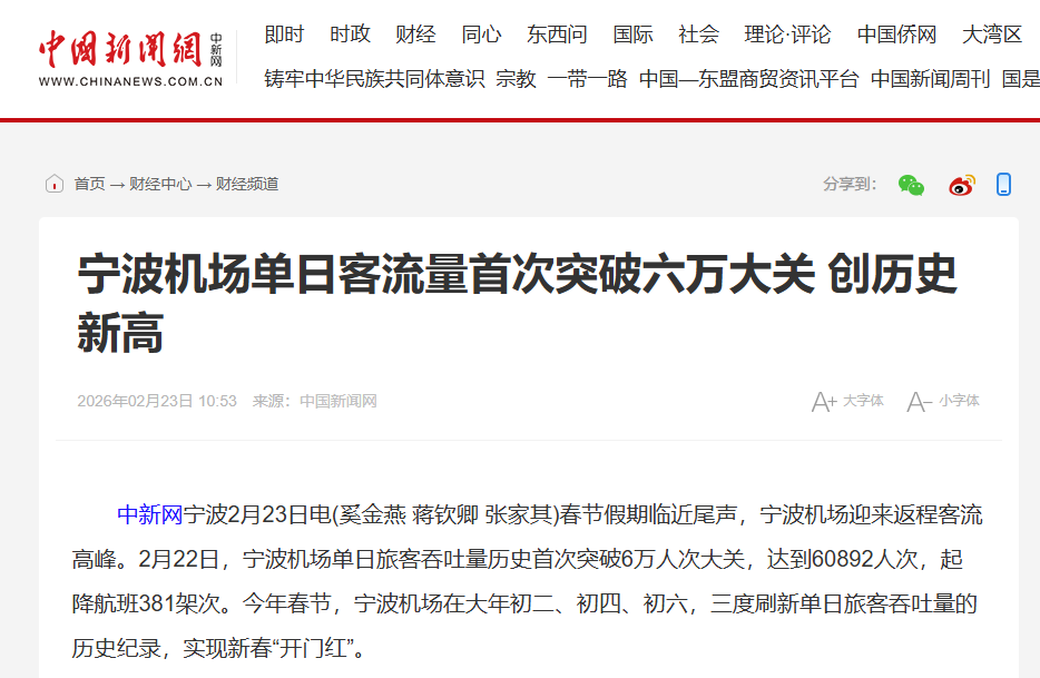 2月23日,中新网发布《宁波机场单日客流量首次突破六万大关 创历史新高》。