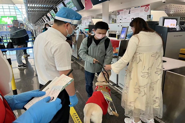 得知李先生需要携带导盲犬乘机出行,宁波机场地勤公司值机科值班主任第一时间赶到现场,按照行业相关规定,查验了导盲犬有效的身份证明、检验检疫证明及残疾人证明,后立即将相关情况上报航空公司工作人员,为李先生临时申请服务。经研判,航空公司同意李先生携带导盲犬乘机申请。