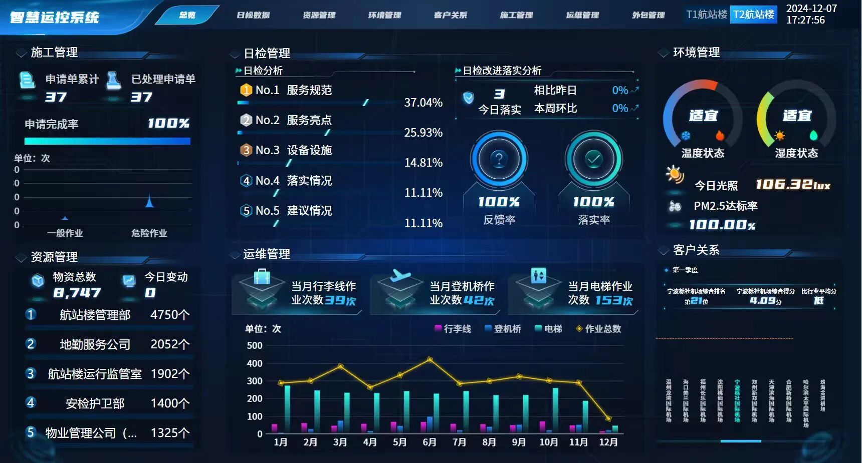 宁波机场航站区智慧协同决策运控平台以航站区智慧运控系统为功能底座和数据框架,部署航站区日检查数据、 资源管理、环境管理、客户关系、施工管理、运维管理、外包管理七大二级模块,构建全景式多矩阵一体化航站区协同决策运控平台(巡航数字梳理),工作人员通过集成大屏随时查看航站区总体运行情况和各二级模块数据研判施策,渐进式建立运行“四网一统”全链四云平台。
