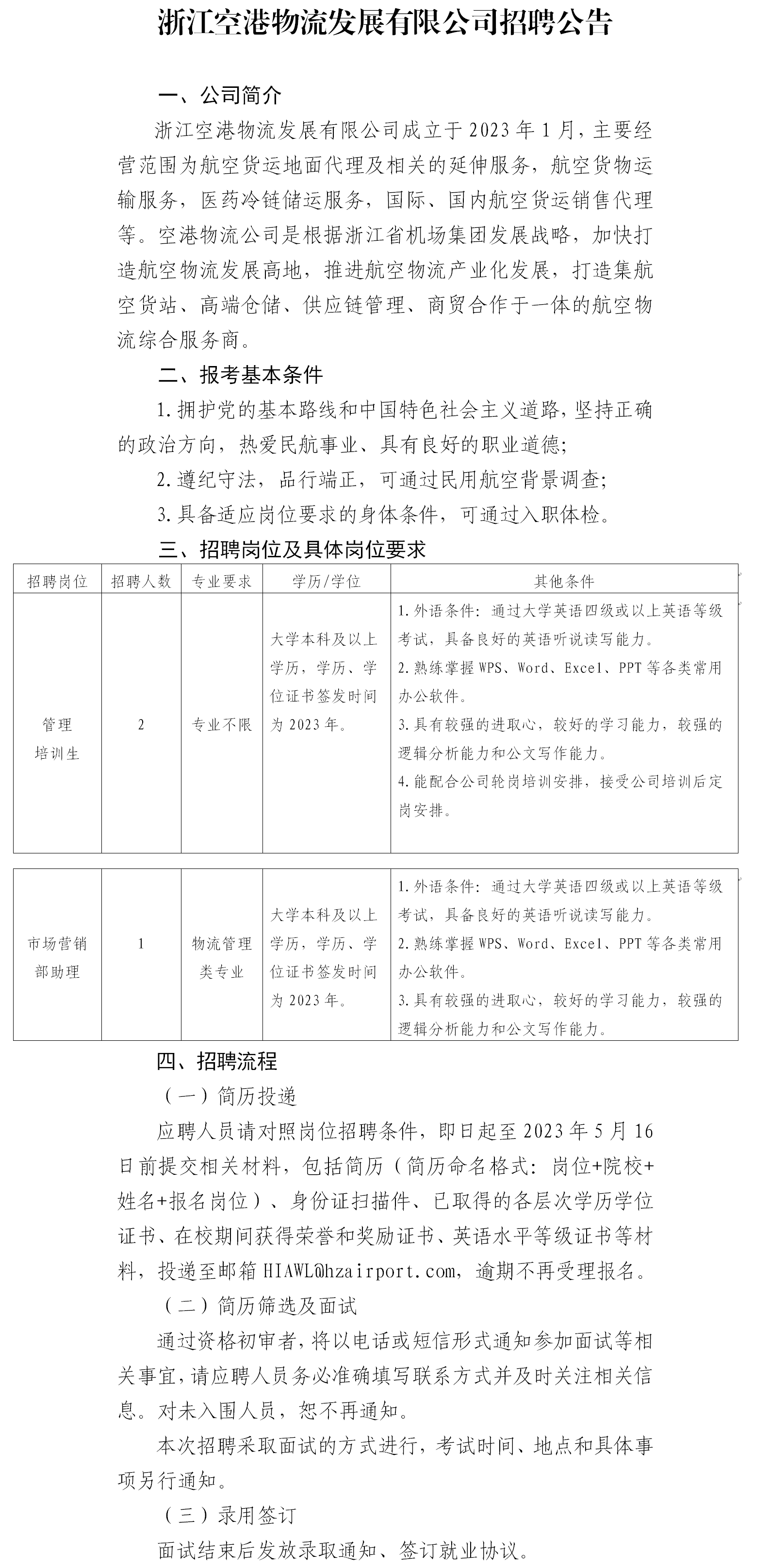 浙江空港物流发展有限公司招聘公告
