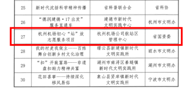 近日,浙江省委宣传部(省文明办)公布了2025年全省新时代文明实践推广项目名单,省机场集团推送的杭州机场初心“站”放志愿服务项目成功入选,成为省属企业中唯一获此殊荣的推广项目。