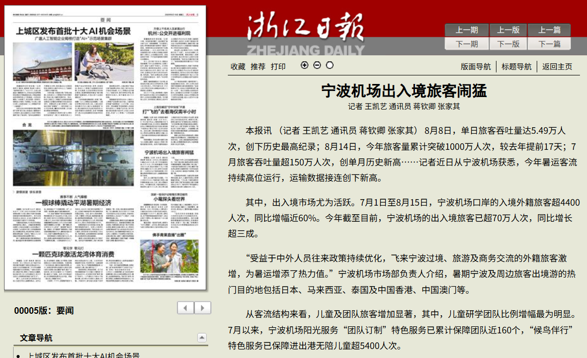 7月31日,浙江日报报道《宁波机场出入境旅客闹猛》。