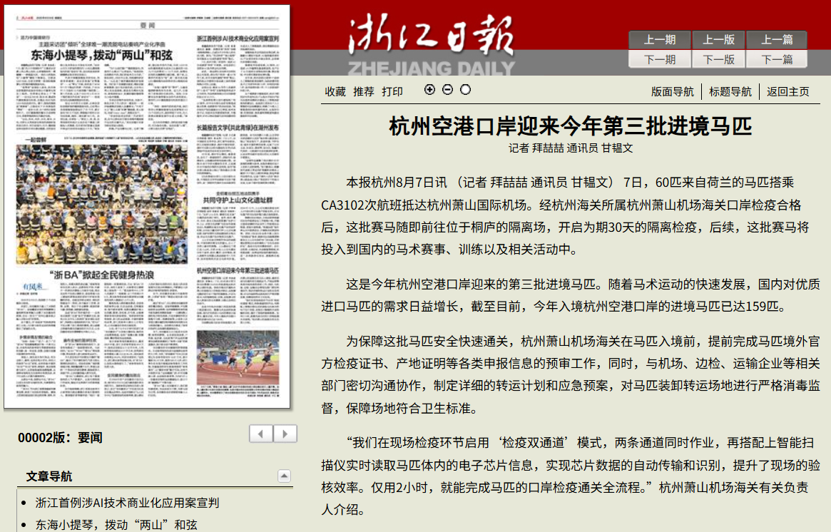 8月7日,浙江日报报道《杭州空港口岸迎来今年第三批进境马匹》。